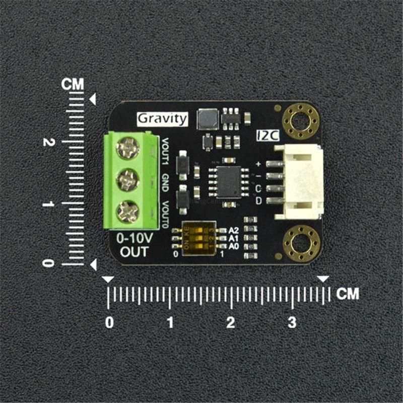 This 2-Channel I2C DAC module can output a voltage of 0-10V, which is a standard driver in industrial applications. It can be widely used with most 0-10V devices on markets such as light controllers, inverters, valves, pumps, etc, by Arduino programming.