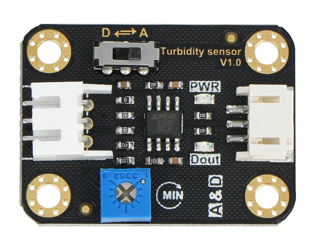 This Arduino turbidity sensor has both analog and digital signal output modes. You can select the mode according to the MCU as the threshold is adjustable in digital signal mode.