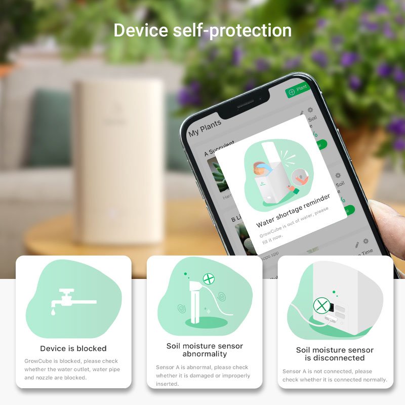 GrowCube has built-in anomaly detection that can trigger the device’s self-protection mechanism. When the condition occurs, the device will beep and some prompts will pop up in the APP. After more than 3 times, the GrowCube will automatically lock, increasing the life of the device. |