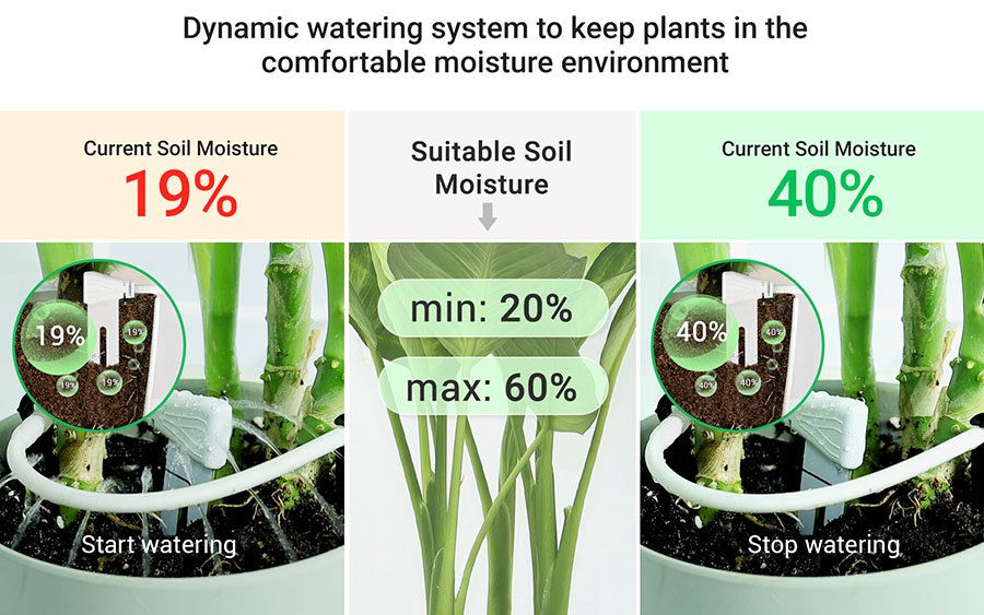 GrowCube can independently monitor the soil moisture of up to 4 pots of different plants at the same time, and control the water output of each outlet accordingly, realizing fine watering management of each pot of plants. |