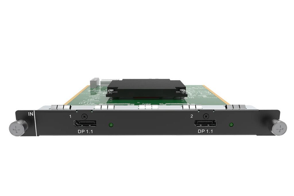 The H Series 2x DP 1.1 Input Card is an input card for the H Series H2/H5/H9/H15 Video Wall Splicers. It is HDCP 1.3 compliant. It accepts two DP 1.1 signals and supports 8- and 10-bit video signals. Each connector supports resolutions of up to 3840×2160 @30 Hz or 3840×1080 @60 Hz. Two status LEDs indicate if the input signal is valid.