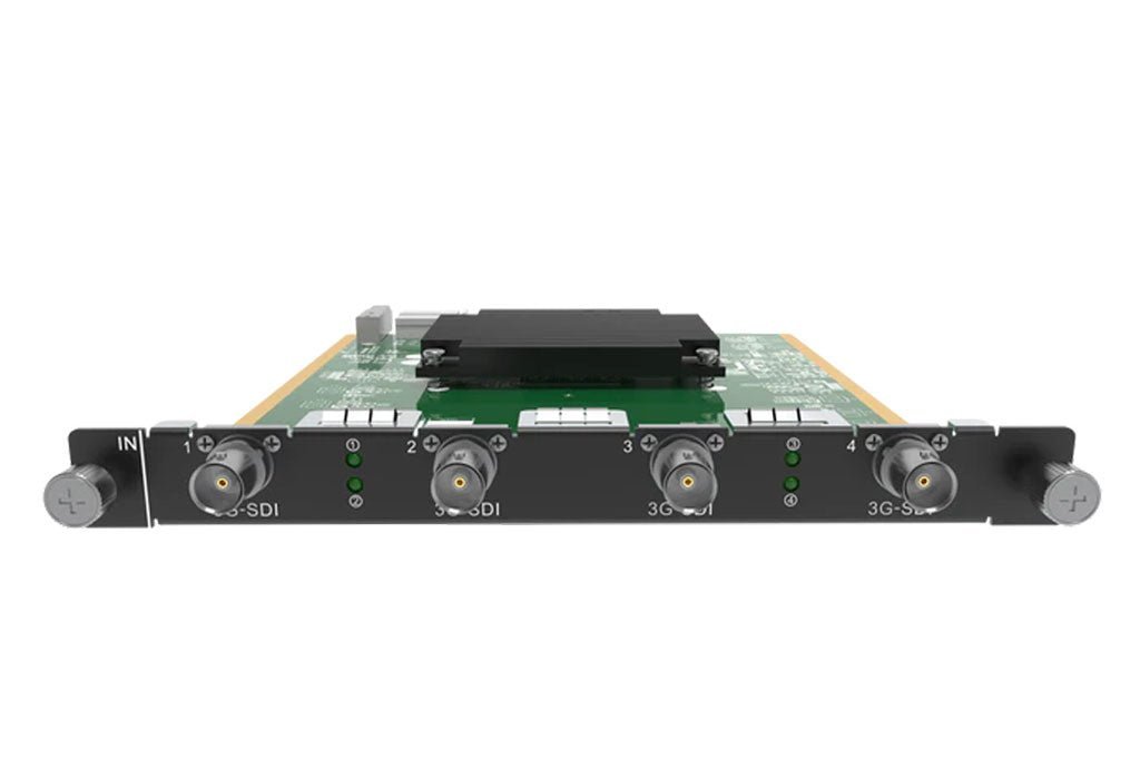 The H Series 4x 3G-SDI Input Card is an input card for the H Series H2/H5/H9/H15 Video Wall Splicers. Each connector supports resolutions of up to 1920×1080 @60 Hz and 1080i/576i/480i de-interlacing processing. It supports ST-424 (3G), (HD), and SMPTE 259 SD input signals. Four status LEDs indicate if the input signal is valid.
