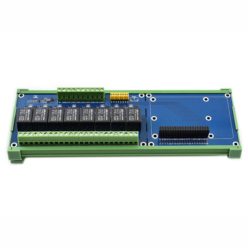 RPi Relay Board (B) – 8-Ch Relays Expansion Board for Raspberry Pi. Control high voltage products using your Raspberry Pi. Supports Raspberry Pi A+/B+/2B/3B/3B+. High-quality relays load up to 5A 250V AC or 5A 30V DC. Photocoupling isolation for interference prevention. Standard rail mount bottom case. Onboard LEDs for indicating relay status. Relay control pin selection jumper for custom pin control. Reserved control interface for working with controllers like PLC. Development resources and examples included.