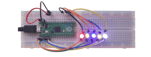 Colorful Flowing Light Through the GP port of the Pico, the 5 LED lights are controlled to light up in turn, and then turn off in turn to form a Colorful flowing light. |