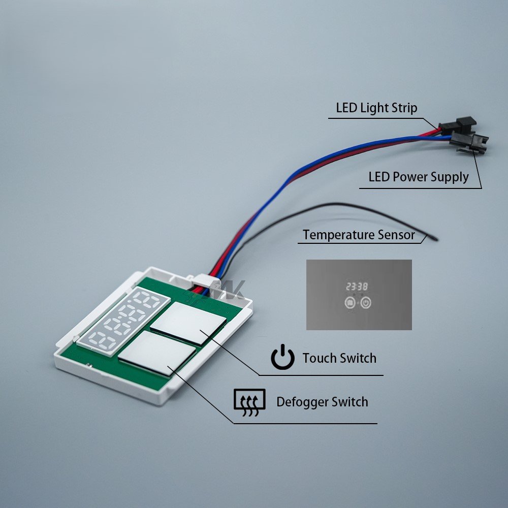 Perfect For: Large bathroom mirrors, commercial installations, hotel bathrooms, spa facilities, and any installation where dual-key control with three-color options, temperature display, defogger functionality, and maximum 60W power capacity is desired.