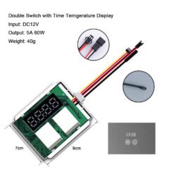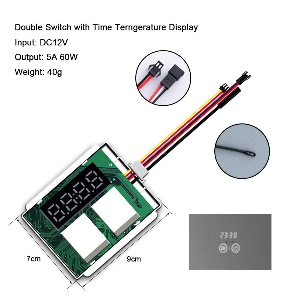 This sophisticated dual touch sensor switch features two independent buttons with three color temperature control, integrated defogger control, and a digital display showing temperature. The unit accepts DC12V input and delivers 60W of power, making it perfect for large bathroom mirrors and commercial installations.